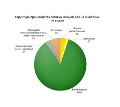 В структуре производства готовых кормов для сельскохозяйственных животных 85% занимают комбикорма, 4% — растительные корма, 3% — концентраты, 1% — премиксы.