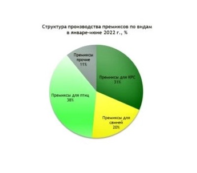 Объем производства премиксов в январе–июне составил 253 тысячи тонн (+6% год к году). В этом сегменте 38% приходится на кормовые добавки для птицы, 31% — на компоненты кормов для крупного рогатого скота, 20% — на премиксы для свиней.
