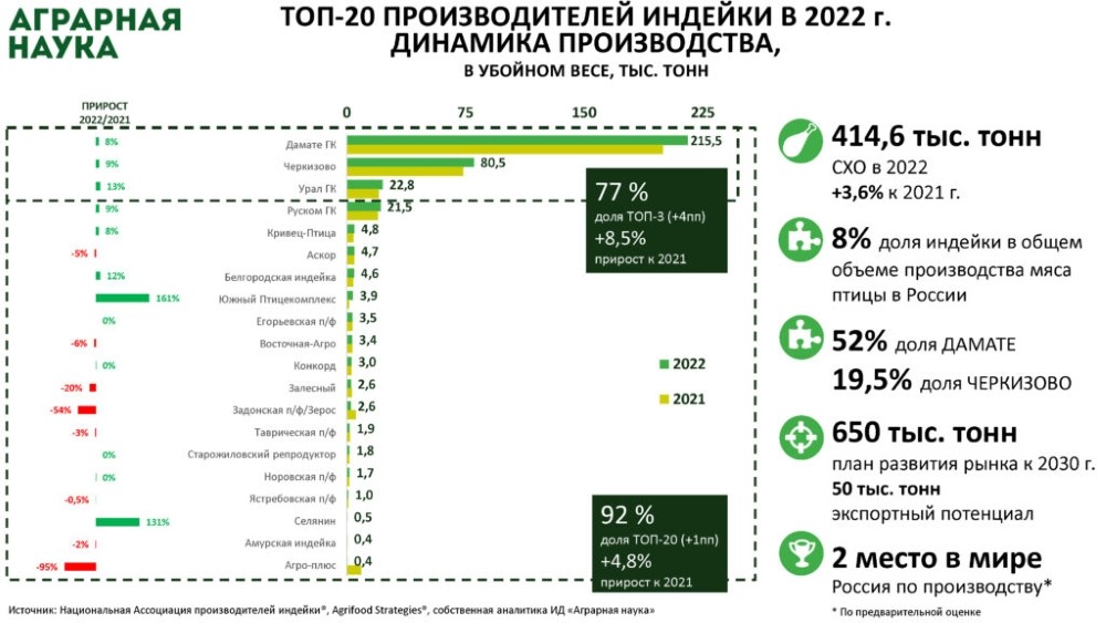 Отраслевой портал издательского дома «Аграрная наука» опубликовал рейтинг производителей индейки, составленный Национальной ассоциацией производителей индейки (НАПИ) по итогам 2022 года.