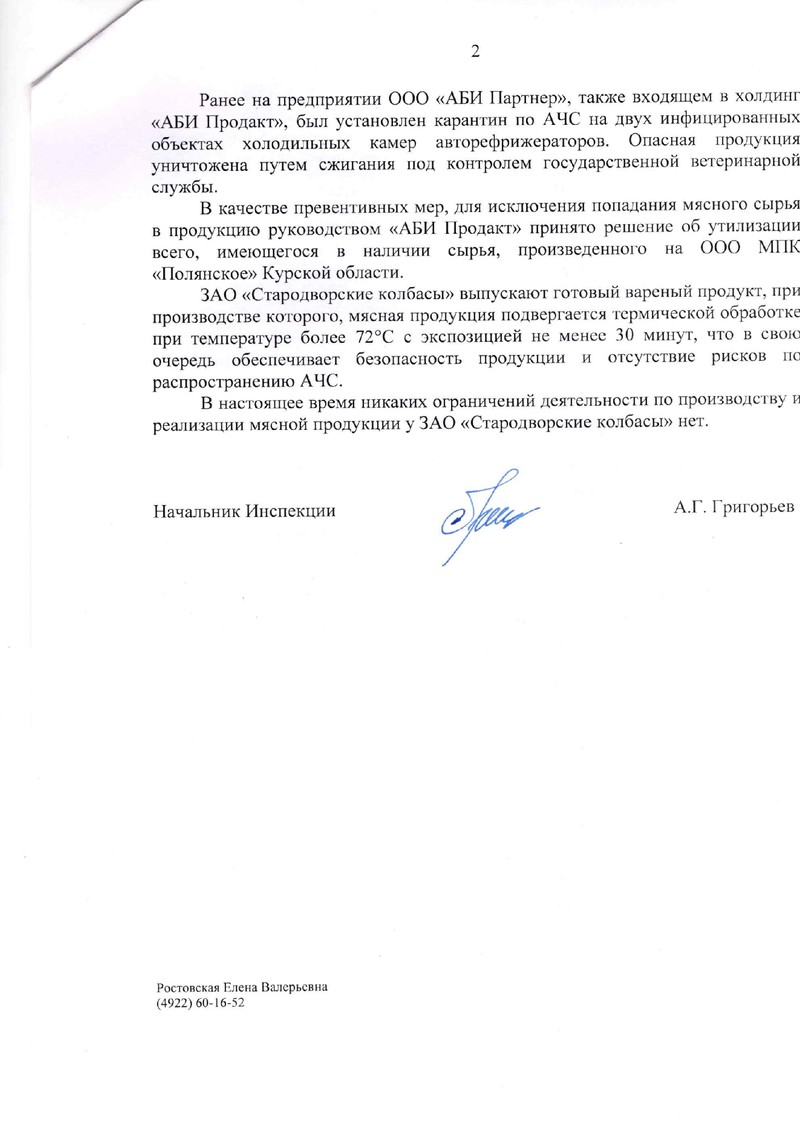 Дополнительно отобраны образцы проб готовой продукции, смывов из производственных помещений ЗАО «Стародворские колбасы» результат. По результатам испытаний образцов получен отрицательный. Фрагменты ДНК вируса АЧС не обнаружены. Предприятие ЗАО «Стародворские колбасы» осуществляет свою деятельность без ограничений (См. приложение: сообщение Инспекции государственного надзора в области обращения с животными и ветеринарии Владимирской области «О ветеринарном благополучии»).