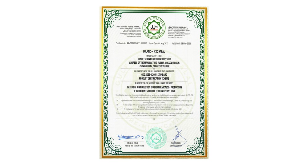 Компания «Профессиональные Биотехнологии» объявляет о значимом достижении: успешном прохождении сертификации «Халяль» по международному стандарту GSO 2055-1:2015 для категории «Производство ингредиентов для дальнейшего применения в пищевой промышленности», что подтверждает высокий статус и беспрецедентное внимание к технологиям производства и качеству готовой продукции.