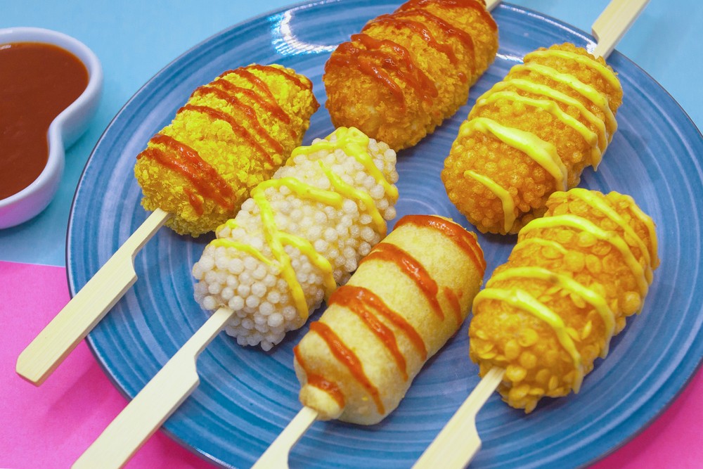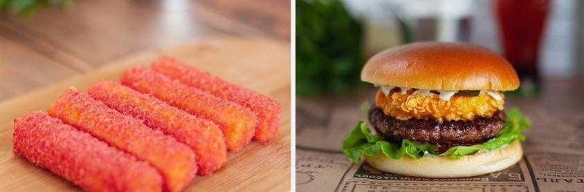Сырные палочки в розовой панировке и бургер с сырной котлетой в панировке «Акедама»