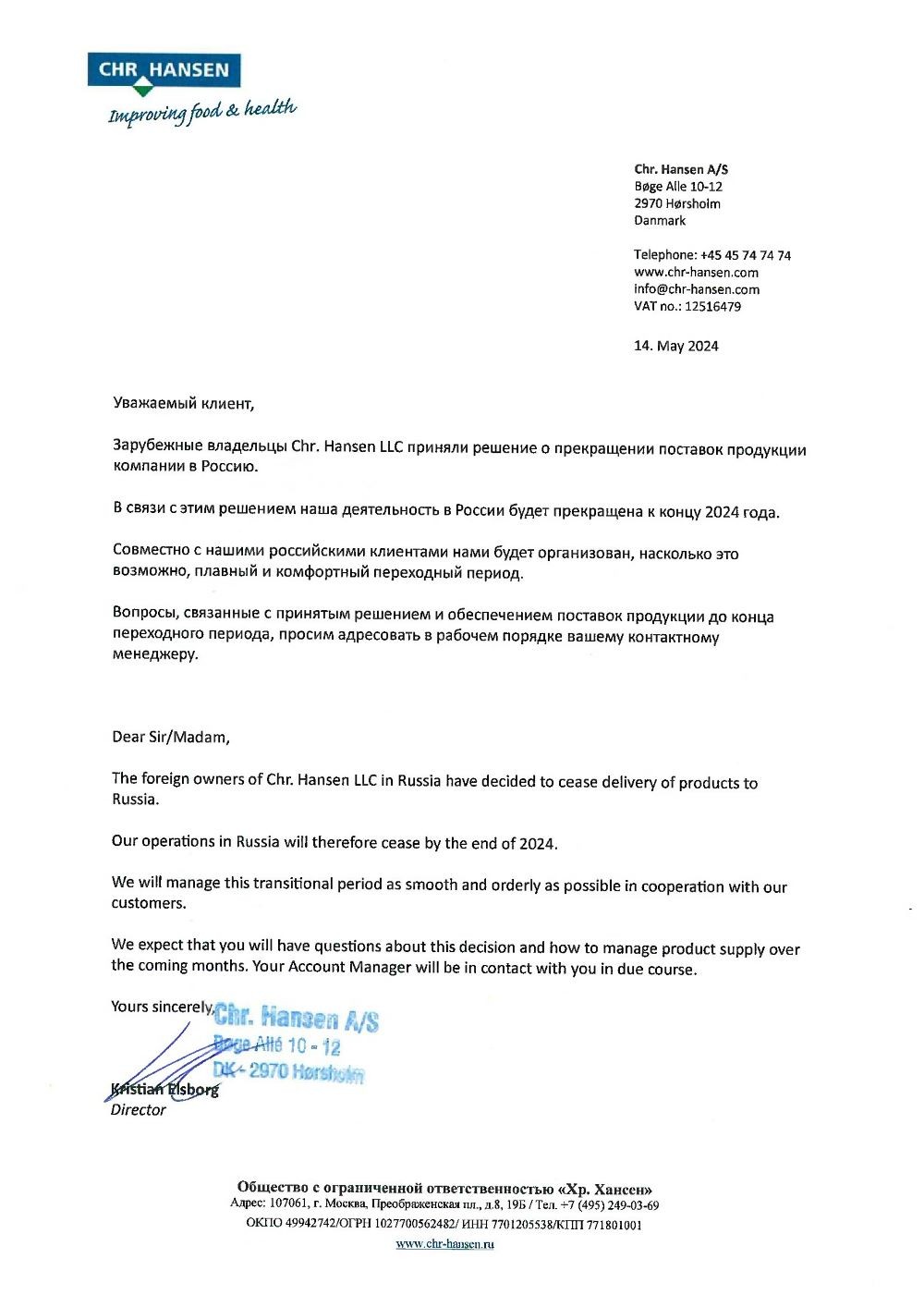 Во вторник, 14 мая российское представительство Chr. Hansen разослало клиентам письмо, известив о прекращении поставок. Его подлинность подтвердили производитель молочной продукции «МолВест» и генеральный директор Национального союза производителей молока (СОЮЗМОЛОКО) Артем Белов.