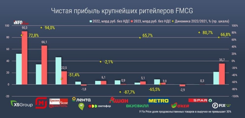 Ашан получил 900 млн рублей чистой прибыли (–87,7%), Metro — 3 млрд рублей (–65,5%). «Лента» и «О’кей» понесли убытки — 1,8 млрд и 2,9 млрд рублей соответственно.