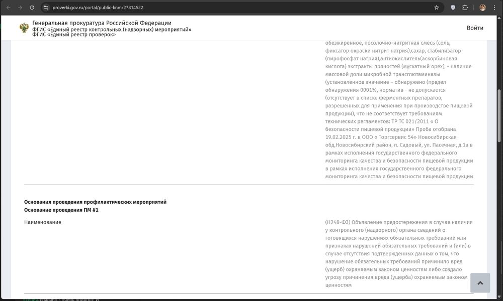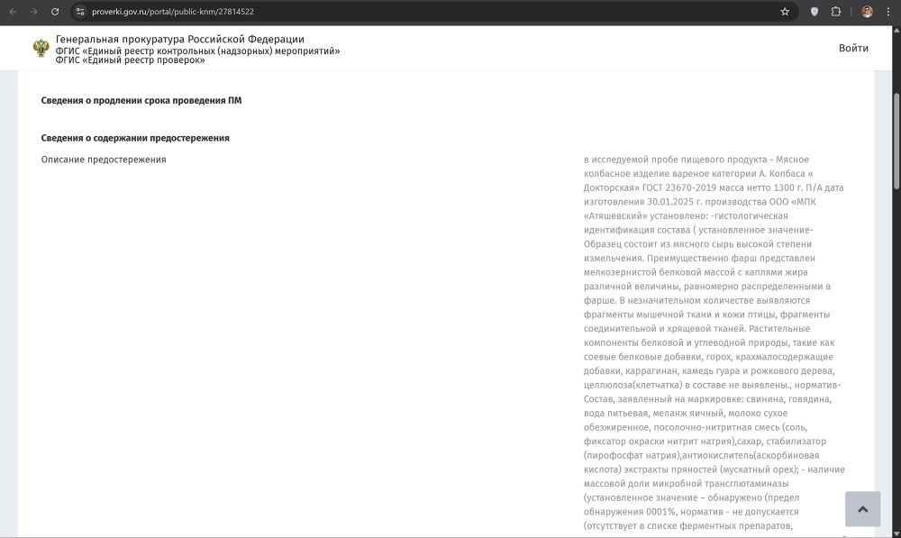 Сегодня утром на основании открытых данных ФГИС «Единый реестр контрольных (надзорных) мероприятий» Генеральной прокуратуры РФ мы опубликовали новость об обнаружении микробной трансглютаминазы и тканей птицы в вареной колбасе «Докторская ГОСТ», выпущенной ООО «МПК „Атяшевский”» из группы компаний «Талина».