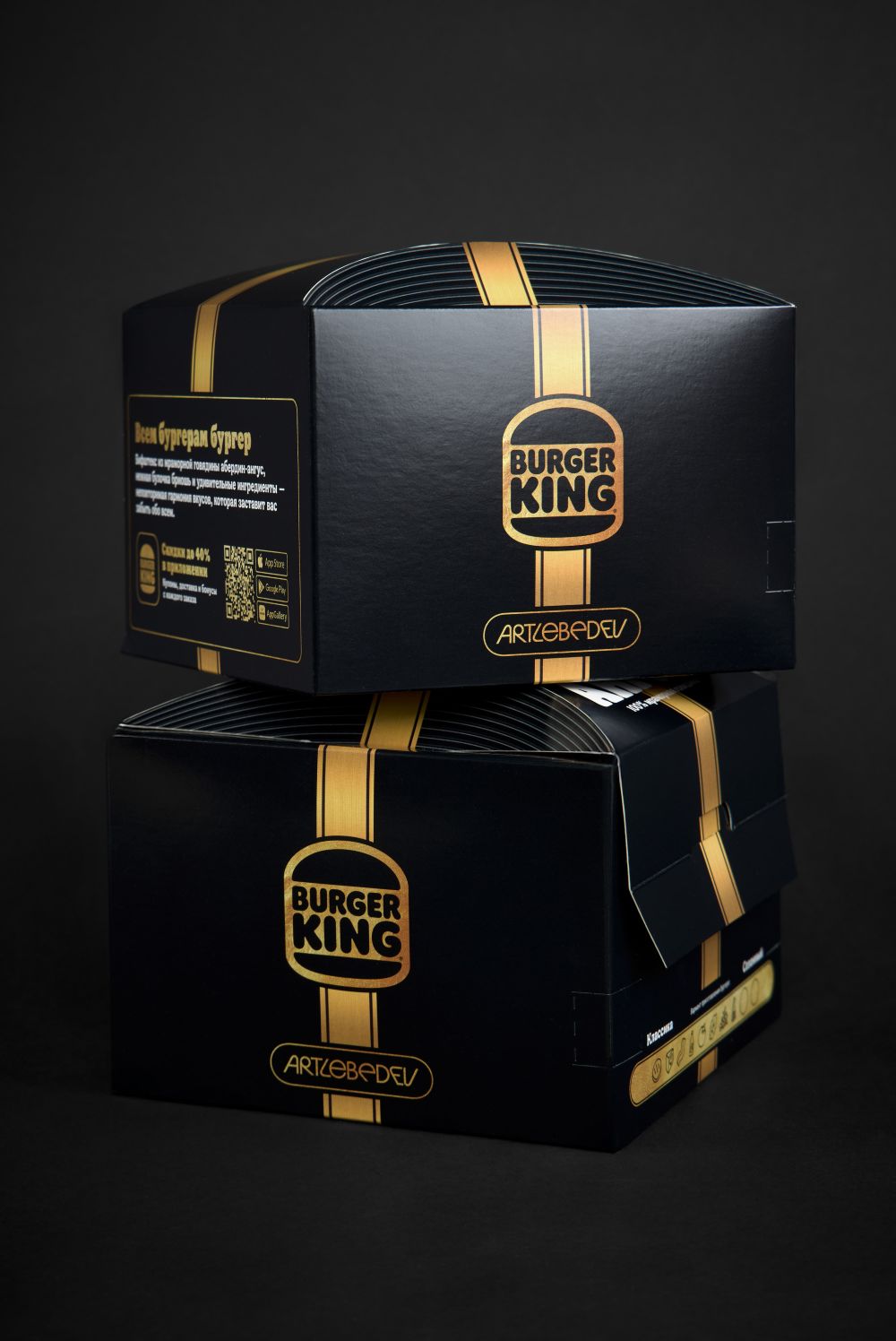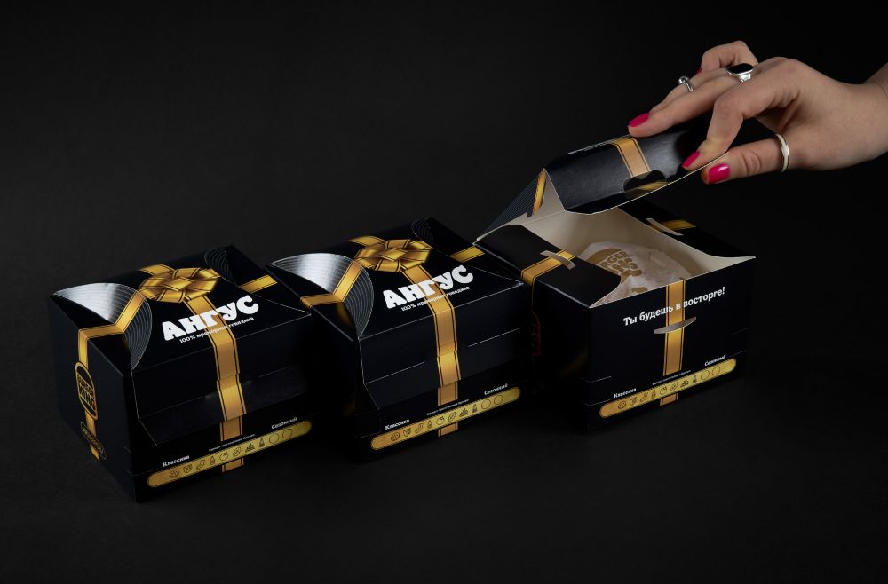 Упаковка бургеров с названием продукта «Ангус» и крупным логотипом Burger King на черном фоне имеет вид подарочной коробки, перетянутой золотистой лентой. Дизайн говорит о том, что эксклюзивный заказ — не просто прием пищи, а знаменательное событие.