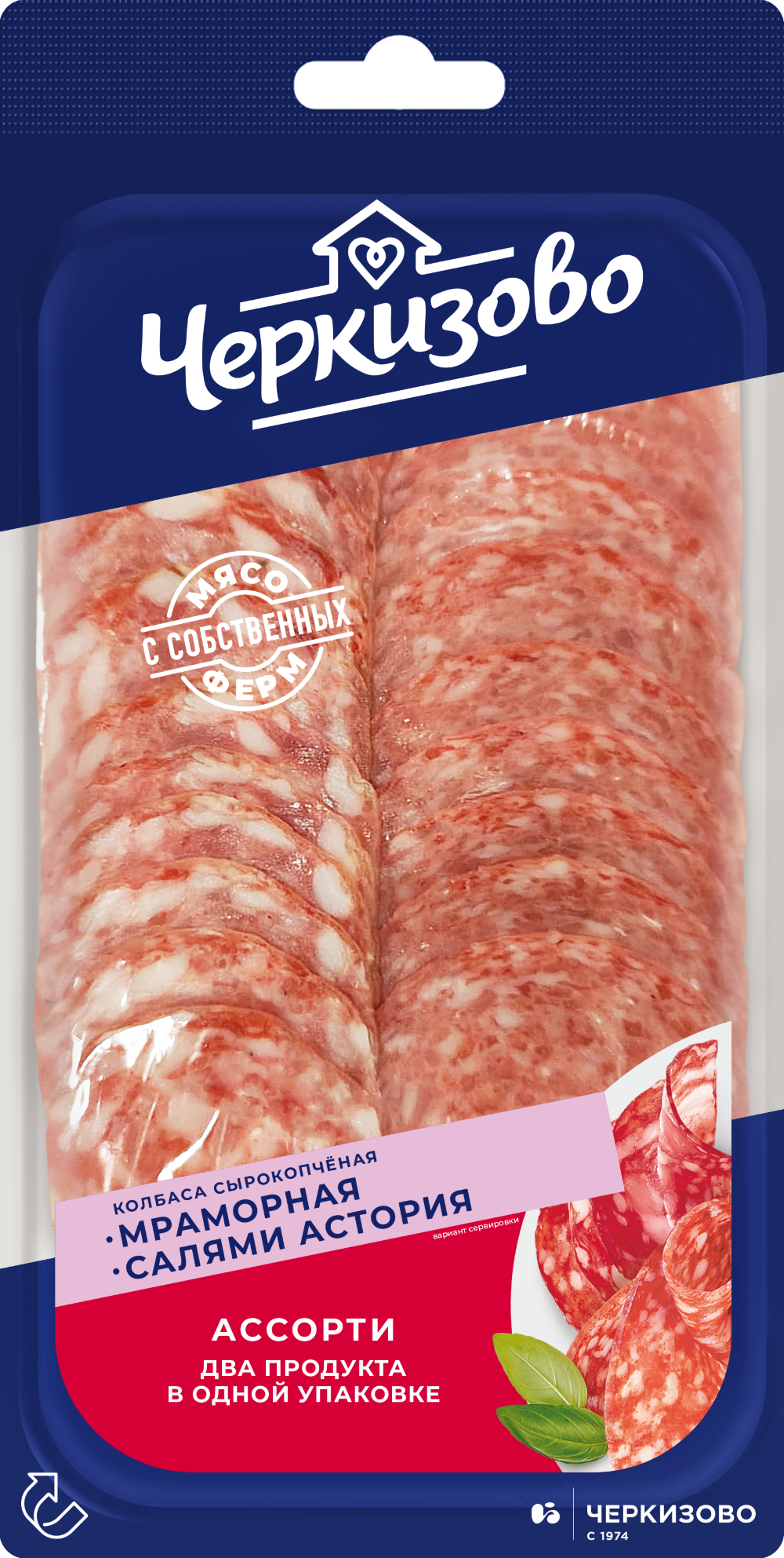 Ассорти «Мраморная» и «Салями Астория» под брендом «Черкизово» представляет собой сочетание двух популярных вида сырокопченых колбас, произведенных по оригинальным рецептурам. Характерная особенность «Мраморной» — выразительный срез с кусочками сочного окорока. «Салями Астория» обладает мелкозернистой структурой. При производстве колбас используются натуральные специи и пряности: перец чили, розмарин, имбирь, душистый перец и мускат.