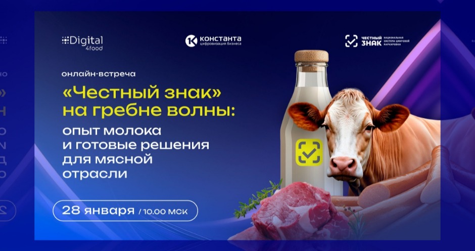 В среду, 28 января, в 10:00 по московскому времени начнется бесплатный вебинар от центра компетенций Digital4food «„Честный знак” на гребне волны: опыт молока и готовые решения для мясной отрасли».