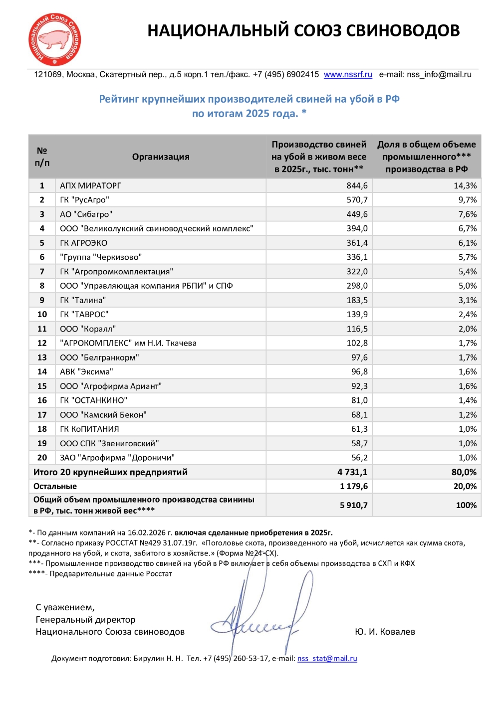 Национальный союз свиноводов (НСС) представил рейтинг ТОП-20 ведущих игроков отрасли по итогам 2025 года, сообщает аналитический журнал «Продиндустрия».