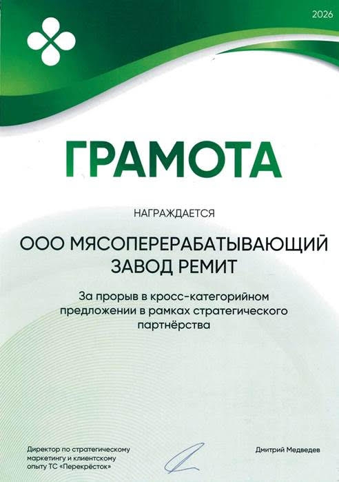 Пресс-служба ООО «Мясоперерабатывающий завод РЕМИТ» благодарит руководство торговой сети «Перекрёсток» за доверие, признание и интересные задачи — их совместные решения поддерживают репутацию бренда как одного из самых инновационных и лучших в отрасли.