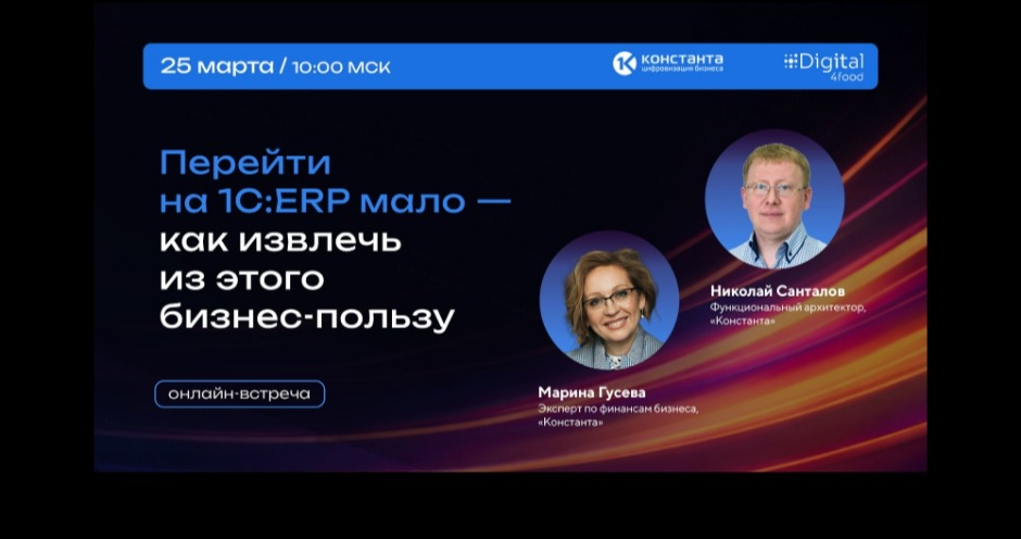 Утром 25 марта компания «Константа» и отраслевое комьюнити Digital4food проведут онлайн-встречу под рабочим названием «Перейти на 1С:ERP мало — как извлечь из этого бизнес-пользу». О чем пойдет речь?