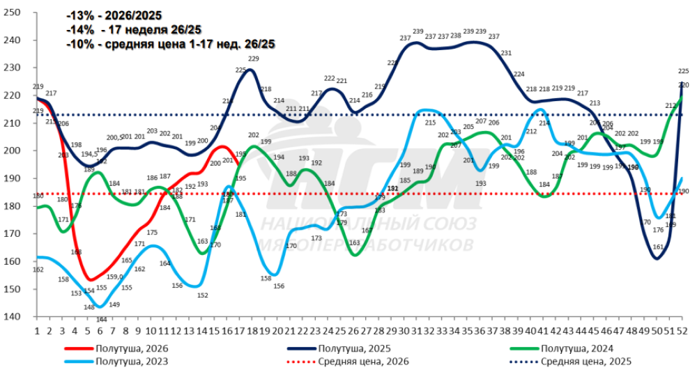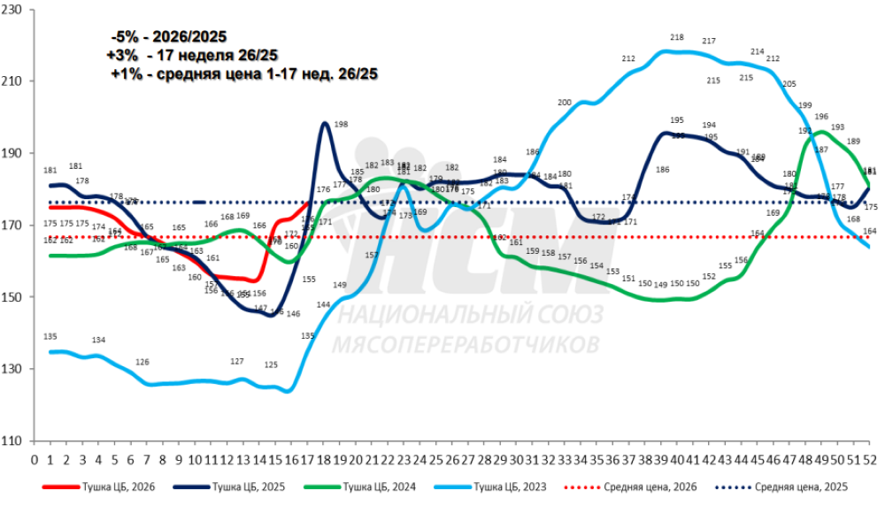 Портал Agrotrend опубликовал индексы цен Национального союза мясопереработчиков (НСМ) на основные виды сырья за 17-ю неделю 2026 года (20–26 апреля) и прогноз на текущую неделю, обозначив тренды.