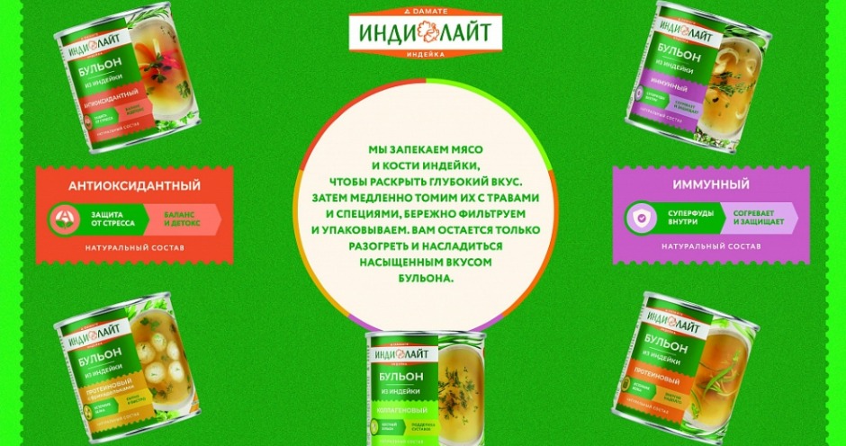 В линейку бульонов под брендом «Индилайт» входит пять видов готовой к употреблению продукции: «Антиоксидантный» для защиты от стресса, «Иммунный» с суперфудами и компонентами поддержки иммунитета, «Протеиновый» с повышенным содержанием белка, «Коллагеновый» для поддержки здоровья суставов и кожи и «Протеиновый с фрикадельками» — более сытный, чем остальные.