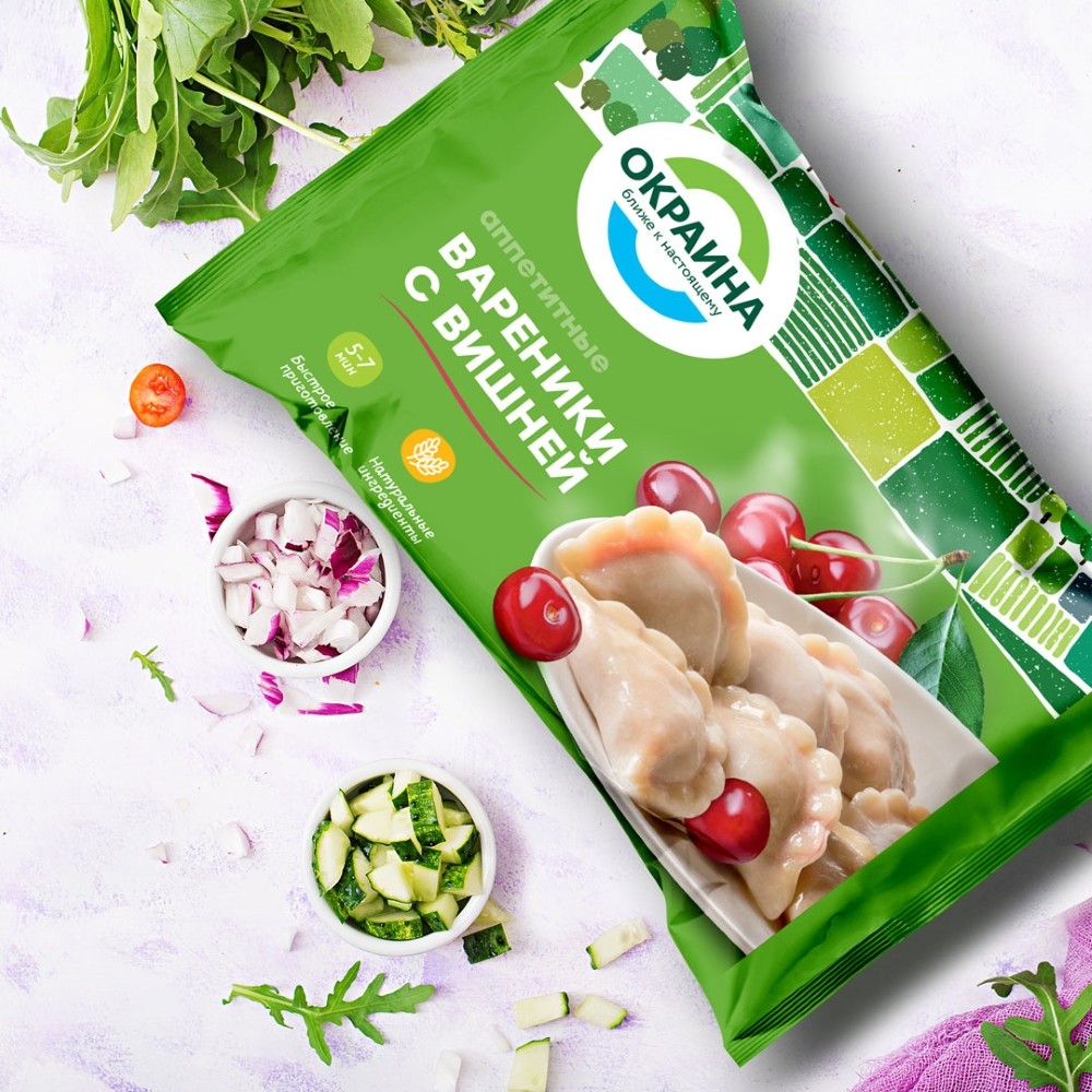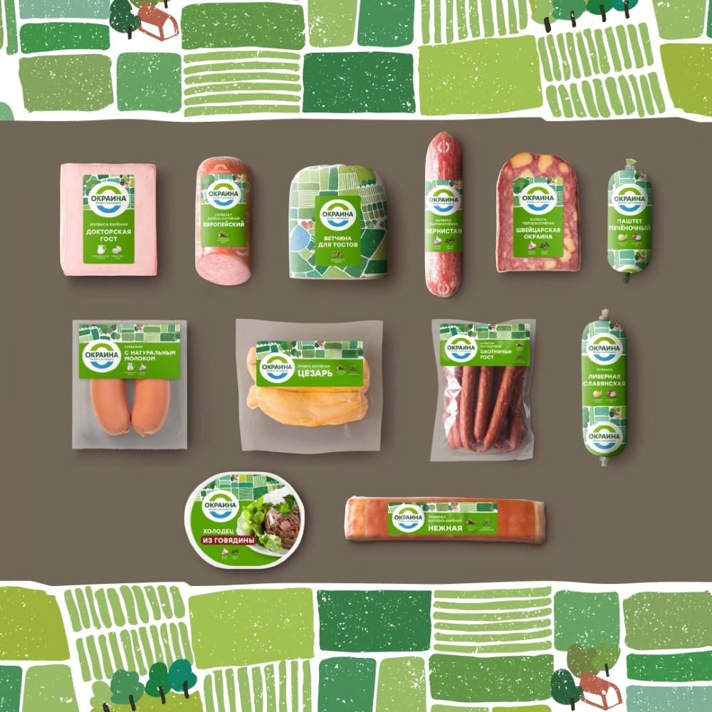 Разумеется, преобразилась упаковка продукции под брендом ОКРАИНА. Например, в центре поля зрения на пакете с полуфабрикатами расположен красочный снимок продукта, только что приготовленного и выложенного на блюдце: от него поднимается прозрачный пар. При оформлении упаковки колбас и мясных деликатесов основным акцентом служит обновленный логотип компании.