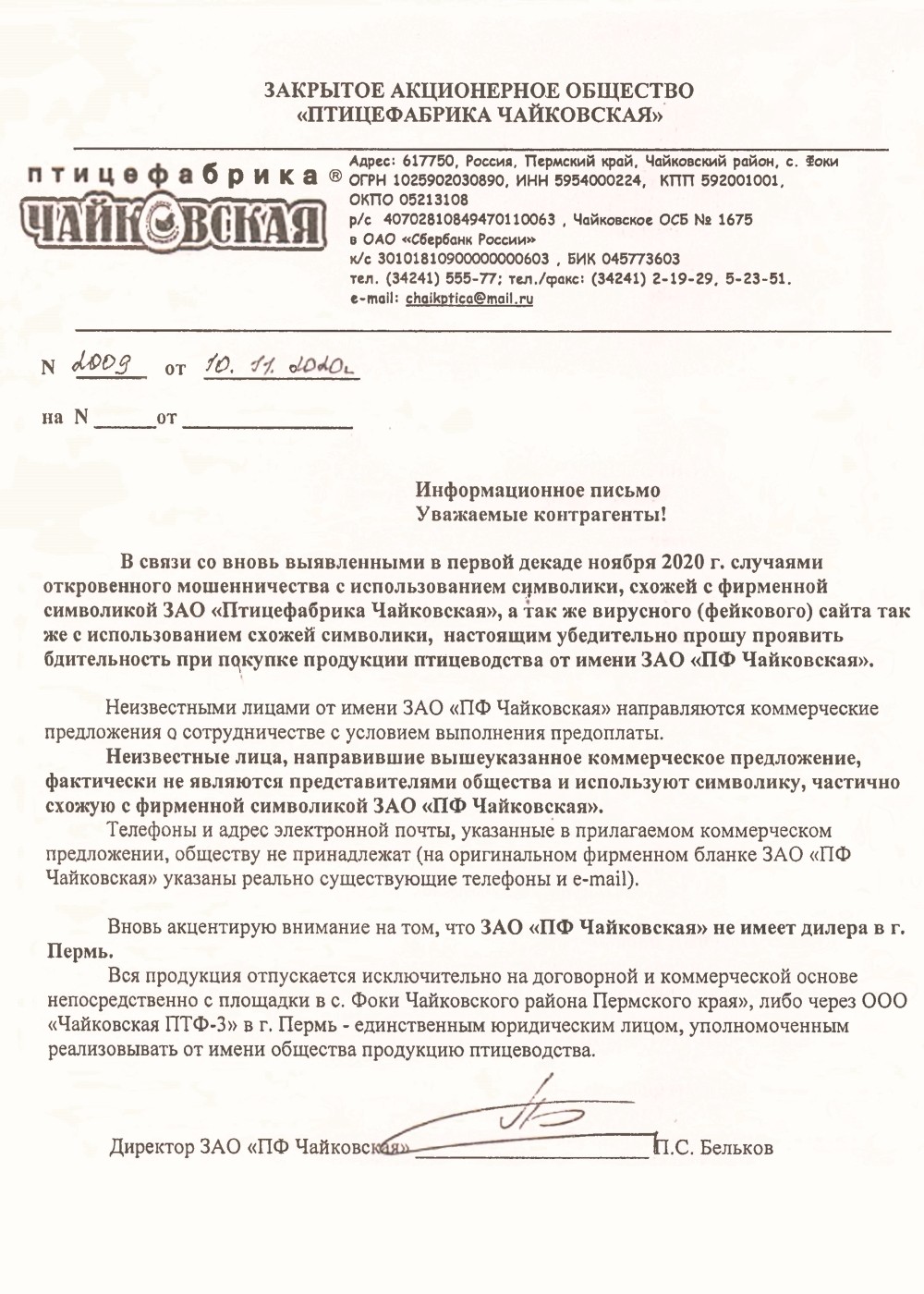 Реквизиты указаны в информационном письме. Контакты с ЗАО «Птицефабрика Чайковская» осуществляются через корпоративный сайт.