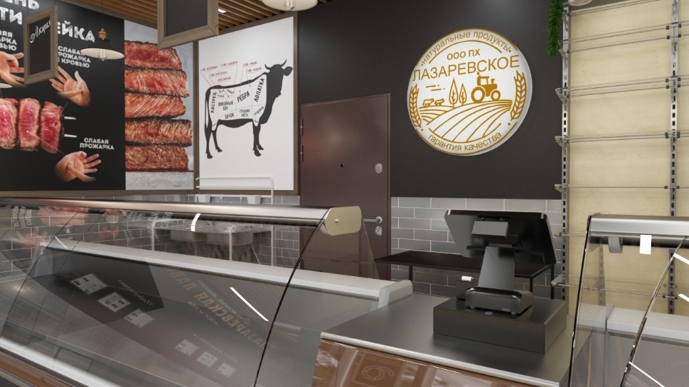 Дизайнеры радикально изменили концепцию интерьера, подобрав гармоничное сочетание цветовой гаммы отделочных материалов. Полы и потолки залов, выдержанные в древесных оттенках, возвращают посетителя к интерьерам торговых залов прошлого и подчеркивают экологичность продукции, представленной в магазине. Нейтральный серый цвет «фартука» из глянцевой плитки малого формата не отвлекает внимание покупателя от витрин и создает ощущение уюта. Стены, окрашенные в глубоко-матовый черный цвет, придают интерьеру камерность и глубину. Контрастный декор в виде графических изображений мясных изделий мелкими акцентами на темном фоне выполнен из объемного белого пластика.
